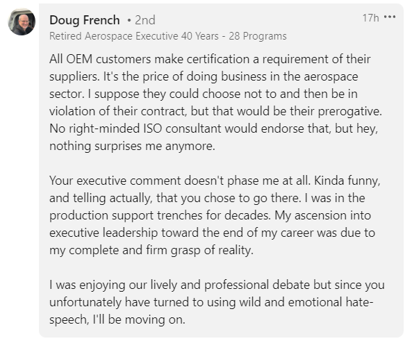 As a result, French said out loud what everyone already knows — Boeing is too cheap to pay for AS9100 certification even as they impose it on their suppliers — while simultaneously giving a masterclass in rich, white privilege and entitlement. Anyone even mildly criticizing him about a professional topic must be engaged in “hate speech” because this vanilla marshmallow has never had to experience actual hate speech.