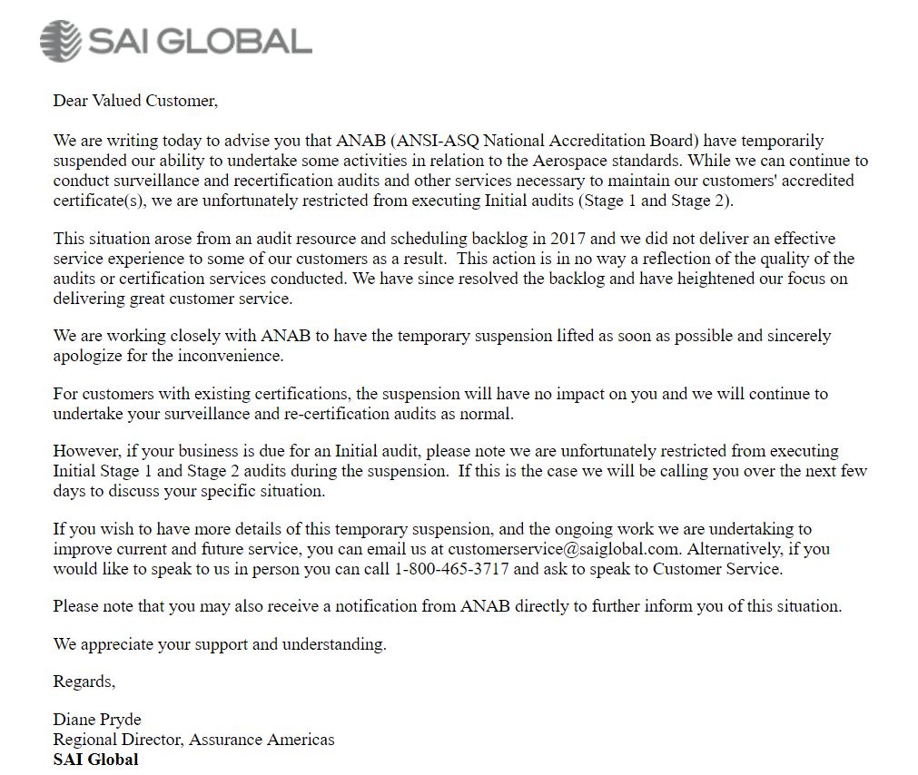 I can’t keep up with this, and none of it makes sense, but here’s SAI’s latest explanation of their ANAB suspension. It only discusses AS9100, but the ANAB suspension was slapped onto nearly all of their certifications, including vanilla ISO 9001, ISO 14001 and even TL 9000. So it’s not clear what they are on about.