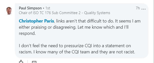 Called out, I challenged him to put his money where his mouth is. I pointed out my success with ASQ, and called on him to demand that CQI denounce racism. The UK is under tremendous turmoil and protests against racism which may be less incendiary than those in the US, but are drawing a lot of attention anyway. The CQI, under the very-white leadership of Vince Desmond, has remained silent on the issue, largely because — IMO — Desmond is a fucking asshole dicksack.