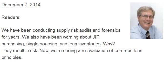 First of all, there’s no “we” unless he has a mouse in his pocket or counts his shadow as a sentient being. Secondly, and as usual, he doesn’t present a single fact to prove his inane, pre-industrial revolution position that “lean inventories result in risk.” And third, well hell, he’s just spending other people’s money like water, like most risk-sellers.