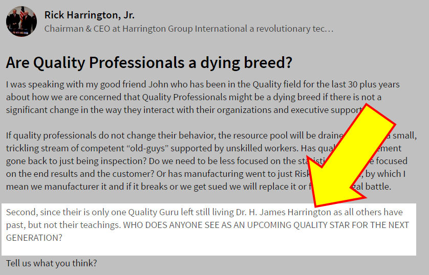 It’s not a problem purely isolated to the West/Hunt self-promotion cash exchange at AQI, either. Over at LinkedIn, Rick Harrington Jr. just declared his dad, James H. Harrington, the last living “quality guru.” The Harringtons have been at this “branding dad as a guru” thing for years, registering domain names and marketing him using the word, oblivious to the quasi-racist aspect of an old, pasty white guy taking on the title of a Hindu spiritual teacher. (These same pasty old white guys would probably argue the point, running to Google and declaring their inner knowledge of the etymology of the word, even if the only other Hindu word they probably know is “curry” and the nickname for that brown-skinned guy at the gas station is “Punjab” despite the fact that he was probably born in Atlanta.)