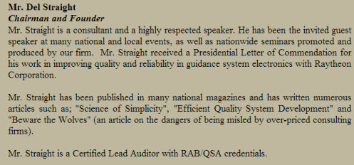 Other curious questions arise, none of which are demonstrative in and of themselves, but which taken together paint an odd picture of a would-be legitimate company. First, there appear to be no businesses registered by Del Straight in the state of Michigan. Nowhere on any of the Del Straight marketing materials is the company name ever mentioned, and therefore there is no indication of “Inc.” or “LLC”. “QSRD” — the company name appearing on his certificates — apparently does not even represent a company, but rather the “Quality System Registration Department.” There are no records of any licensed business under that name.