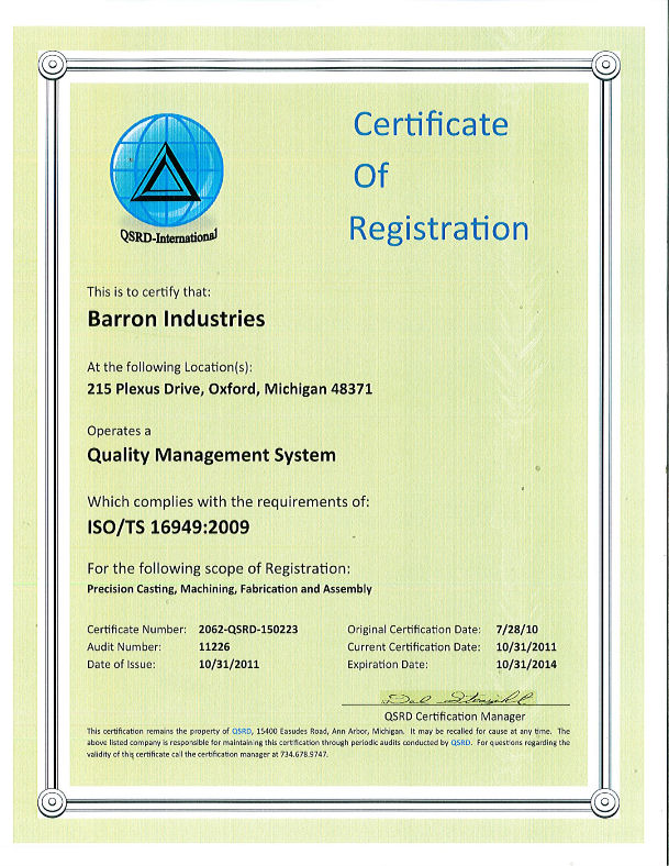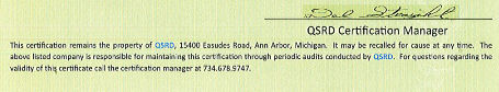 “This certification remains the property of QSRD, 15400 Easudes Road, Ann Arbor, Michigan. It may be recalled for cause at any time.”