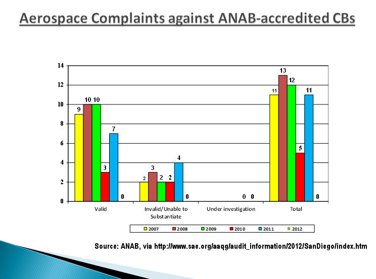 The failure on the part of clients to file complaints leads organizations like ANAB to think that everything is okay. In January 2012, ANAB reported to the IAQG that it had received only 11 — eleven! — complaints against CB’sin all of 2011. (Click graphic at right to see ANAB’s figures.)