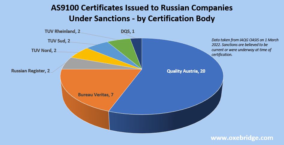 A review of official OASIS data showed that 108 AS9100 certificates have been issued to firms in Russia. Of these, I identified 36 that were for companies under current sanctions or prior sanctions which were in effect at the time the certificates were granted. Almost all of these are international sanctions, meaning issued by the US, UK, EU, and other regional authorities. Four were issued by Ukraine and not necessarily picked up by the rest of the international community. Given that Ukraine is now under invasion by Russia, I think those sanctions matter.