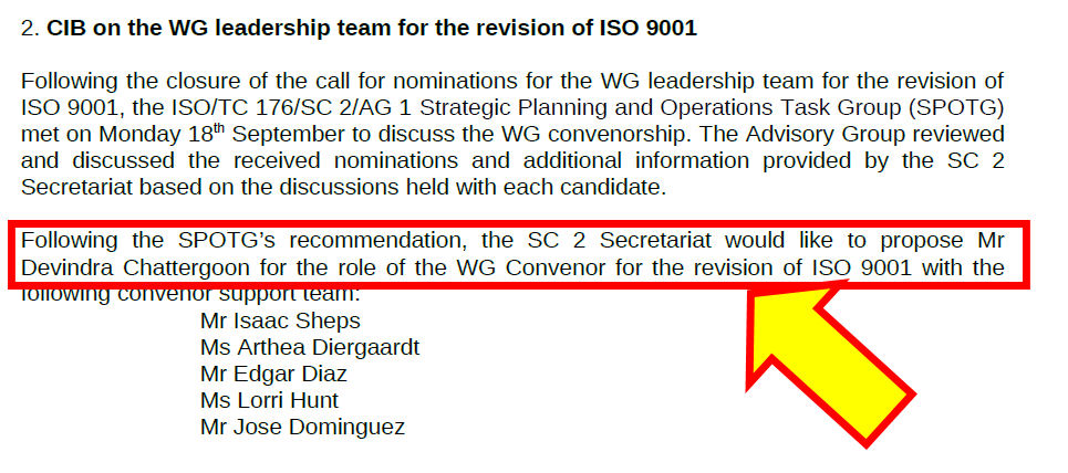 The leadership of TC 176 is pushing members to vote for a “friendly” consultant likely to tow the official party line in heading up the revision of ISO 9001. According to an official memo issued by BSI’s Beata Mroz-Orlikowska, the committee manager for TC 176 Subcommittee 2, the controversial (and ridiculously named) “SPOTG” committee is urging members to confirm Devindra Chattergoon as the head of the ISO 9001 rewrite working group.