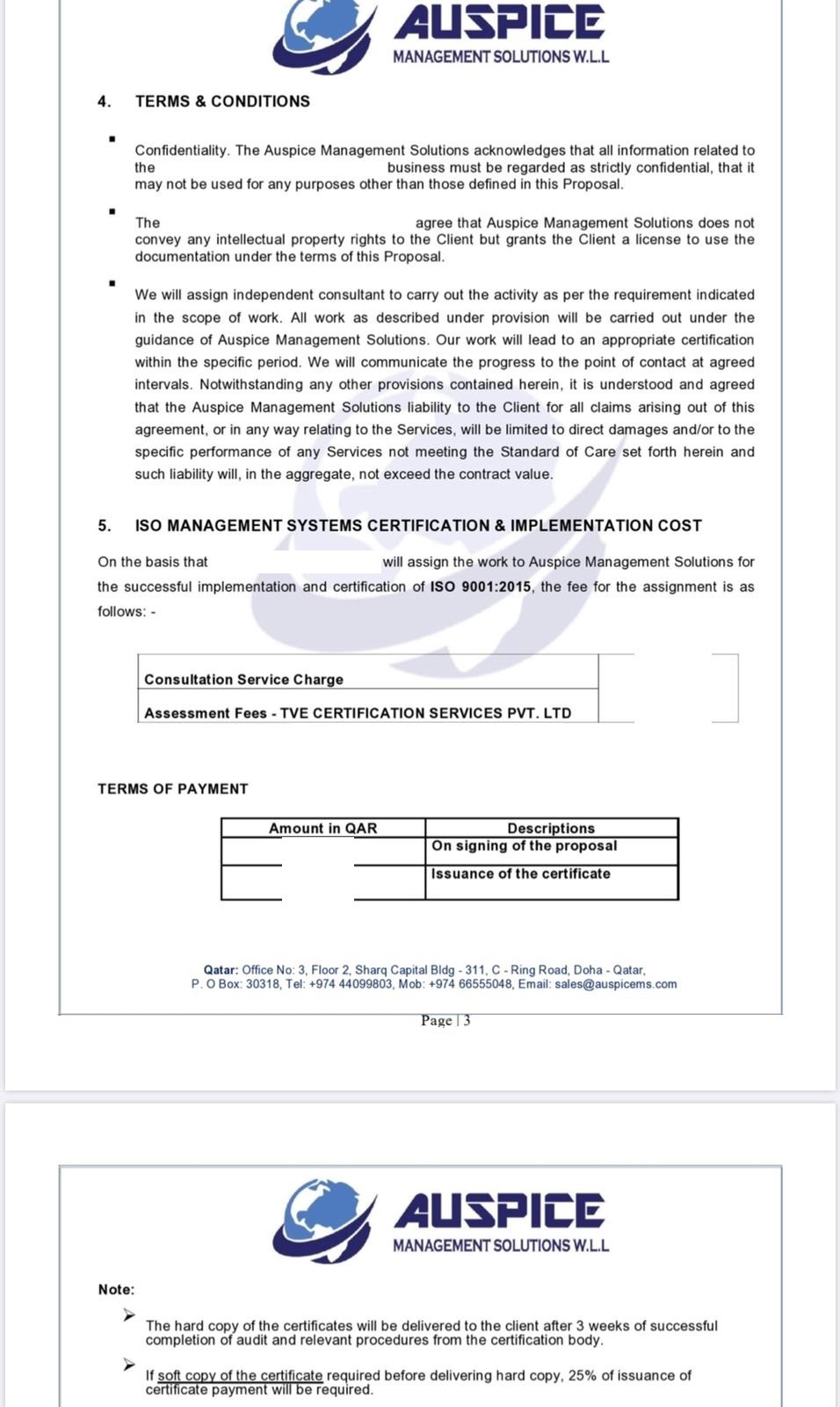 The second body reported was TVE Certifications Services, from India. That CB is also accredited by IAS, but the whistleblower discovered documentation showing the consulting firm Auspice Management Solutions offering simultaneous certification and consulting in a single proposal. Their proposal included pricing and time for certification services payable to TVE.