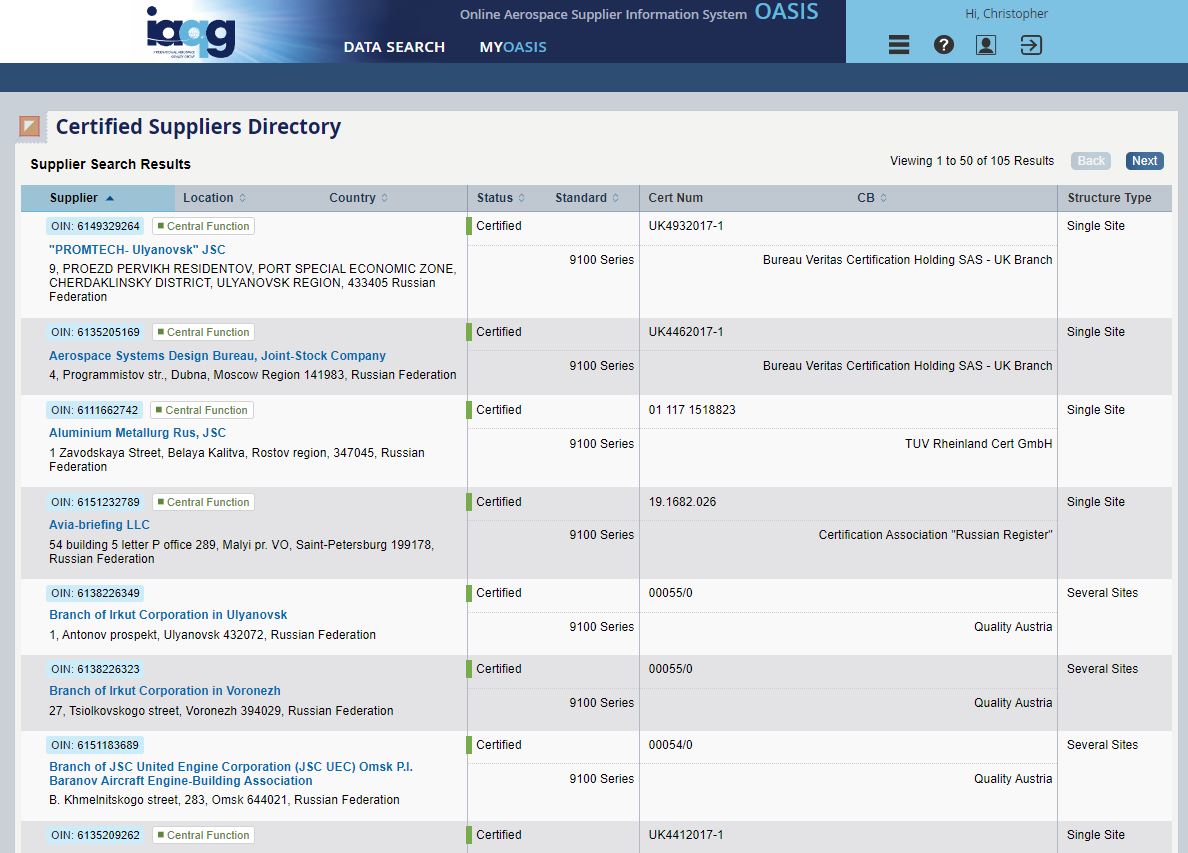 On March 9, IAQG President Andy Maher of BAE Systems announced that, “IAQG will not conduct oversight nor engage with entities in Russia, [and] AS9100, 9110 and 9120 Quality Certificates with Russian entities are no longer recognized and access to the OASIS data base shall be withdrawn.” Despite this promise, the OASIS database continues to list nearly 100 Russian companies as certified, as well as one from Belarus.