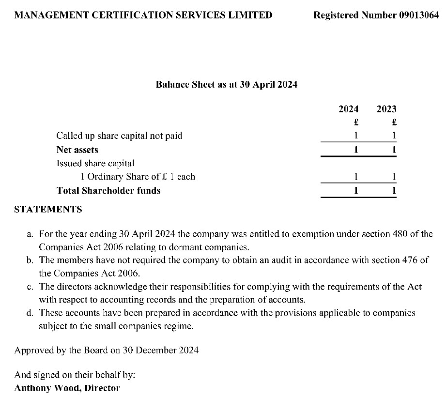 The problem is, UK business filings show MCERT as “dormant” since 2016. This means the company has had no reportable revenue in all those years. The most recent filing from Wood, as of April 2024, looks like this: