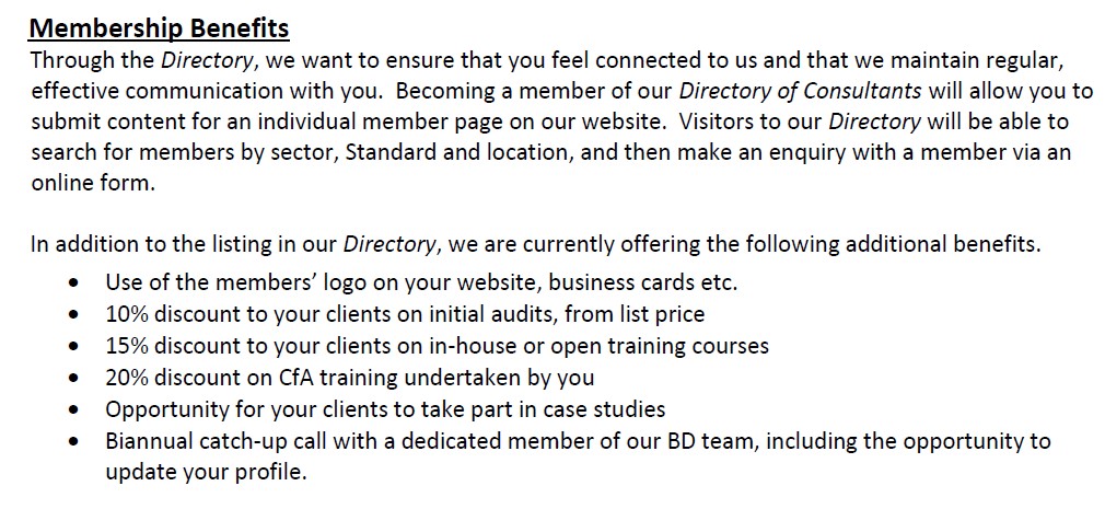 CfA’s “Directory of Consultants” program requires potential member consultants to agree to either submit its clients for certification audits to CfA, or attest that they have already done so. In exchange, CfA grants various “benefits” to the consultant’s clients, including a 10% discount on initial ISO certification audit fees.