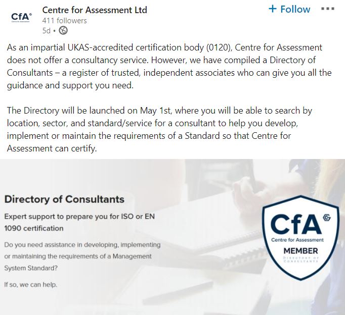 The UKAS-accredited ISO 9001 registrar Centre for Assessment (CfA) is operating a preferred consultant program which then offers various discounts to the clients of such consultants, in apparent violation of ISO 17021-1.