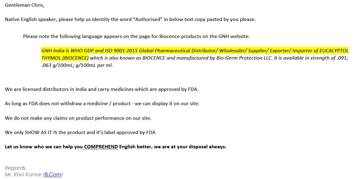 Next, “Ravi Kumar” of GNH India has threatened legal action multiple times, all for telling him that the FDA wants the Biocence products pulled from the market. Mind you, FDA said that, not me, but Kumar wants to sue me for some reason. In his increasingly unhinged emails — clearly not vetted by any actual corporate attorney — Kumar descends into a smug, sneering attack against my “English” comprehension, insisting he’s interpreting the FDA Warning Letter better than I am. He’s not.