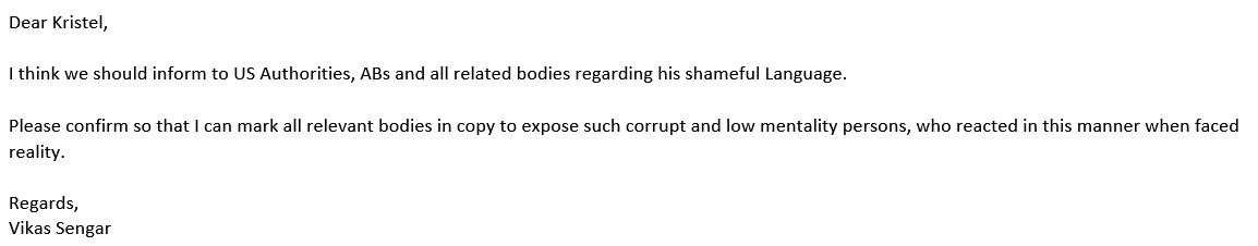 Still ignoring his responsibility to make sure that people don’t die using products from his certified clients, Vikas went apeshit yet again, complaining to Kristel Pitcher, at URS HQ in the United Kingdom: