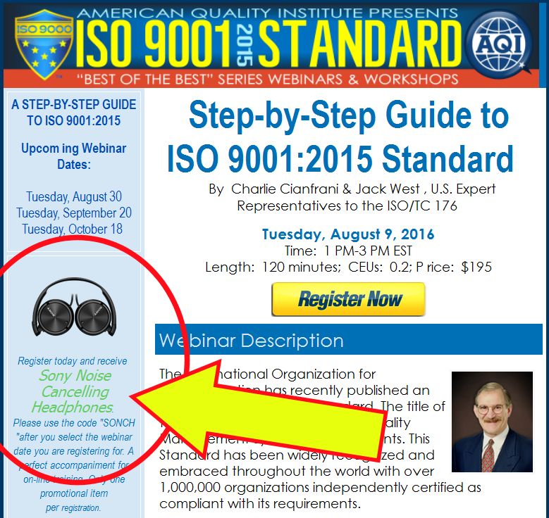 The marketers as Jack West’s American Quality Institute (AQI) seem to have been born without the necessary organs that detect irony, since their latest promotion is to include a free set of noise-cancelling headphones if you attend an ISO 9001 seminar given by West and his TAG co-author Charles Cianfrani.