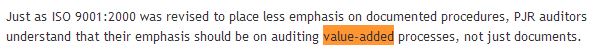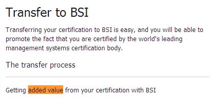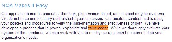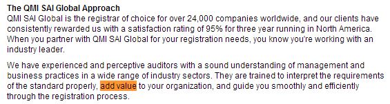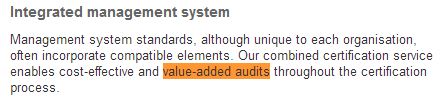 Despite only being accredited for “conformity assessments,” Conformity Assessment Bodies (see? it’s in their name) nevertheless market their services as “value added auditing” in order to distinguish themselves from competitors. Of course nowadays nearly every registrar uses the phrase, so they aren’t differentiating from anything, but the term has stuck.