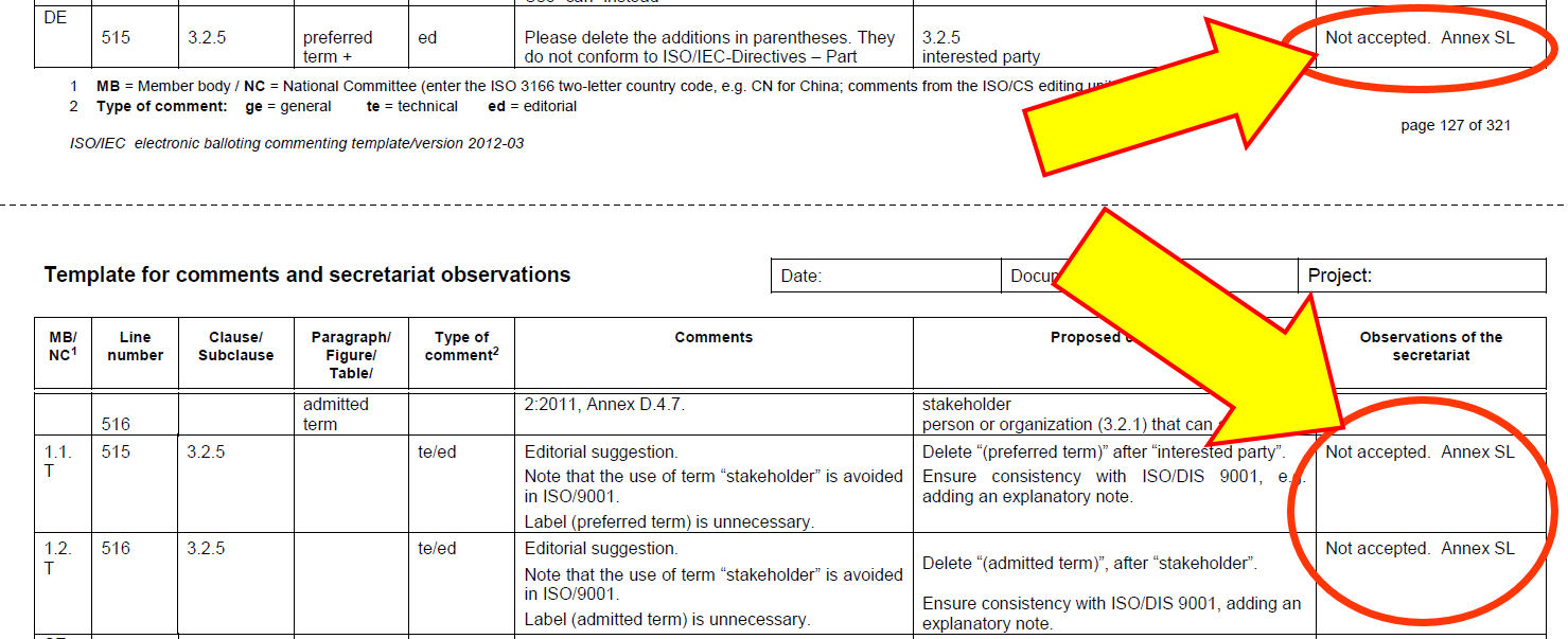 Making matters worse, the Secretary of TC 176 disallowed any actions on comments received that were critical of the Annex SL text that was eventually inserted into ISO 9001:2015. Comments against the Annex SL text were rejected solely on the basis that Annex SL could not be altered in any way. At the DIS stage, the TC 176 Secretary openly noted this as the reason: