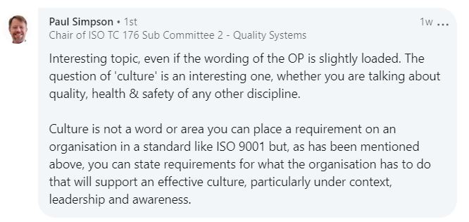 (It’s hilarious that Paul Simpson the Chair of TC 176 SC2, insisted on LinkedIn that ISO 9001 couldn’t address “culture,” when this document shows his own committee — SC2 !! — recommended it be inserted into ISO 9001! It’s clear that Simpson is so busy promoting himself, he doesn’t even know what his own committee is doing.)